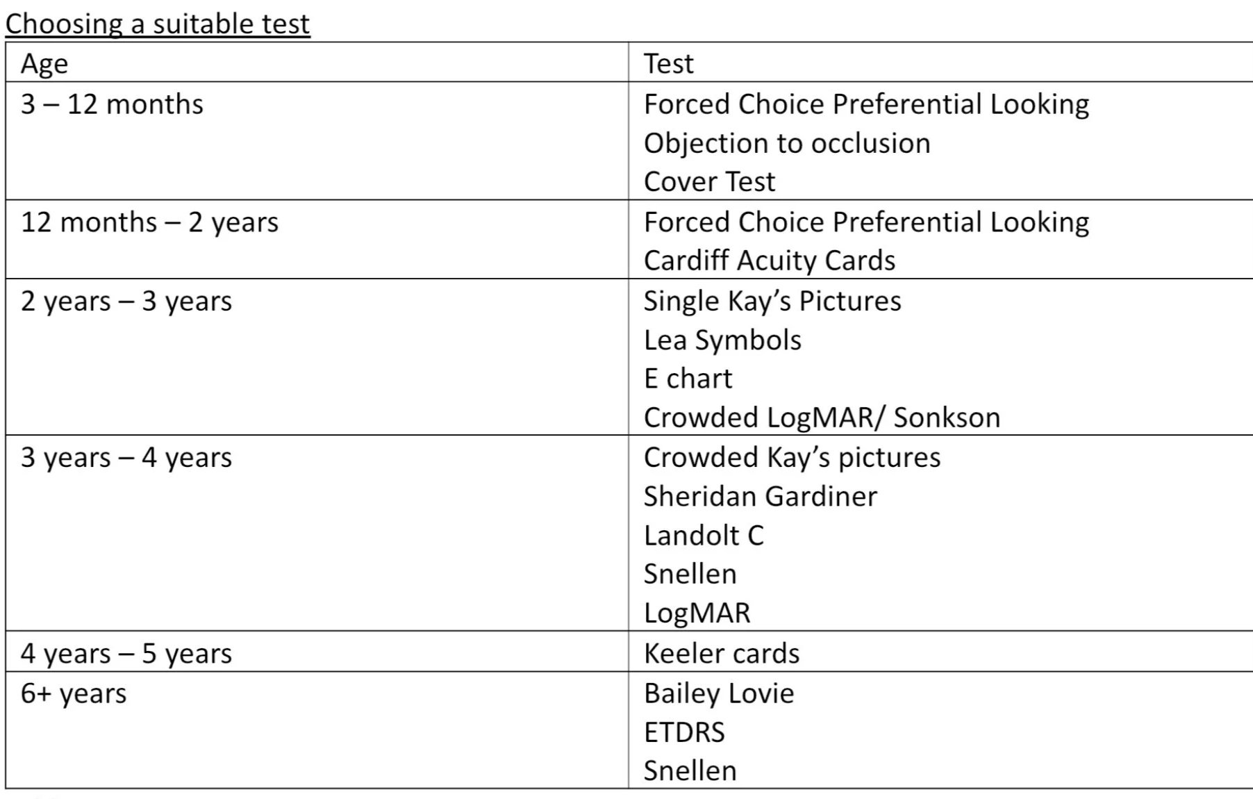 Table 1 shows a rough outline of which tests are the most appropriate for different age ranges. Usually there is no harm in picking a more difficult visual acuity test and changing the option if it is not suitable. Always gauge your patient and pick what you think would be the most appropriate test for them.